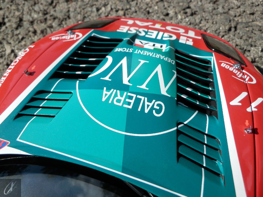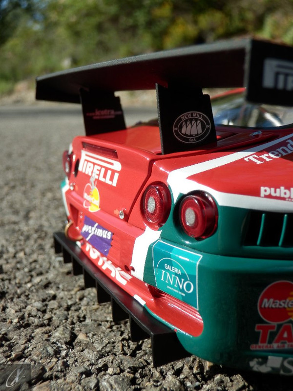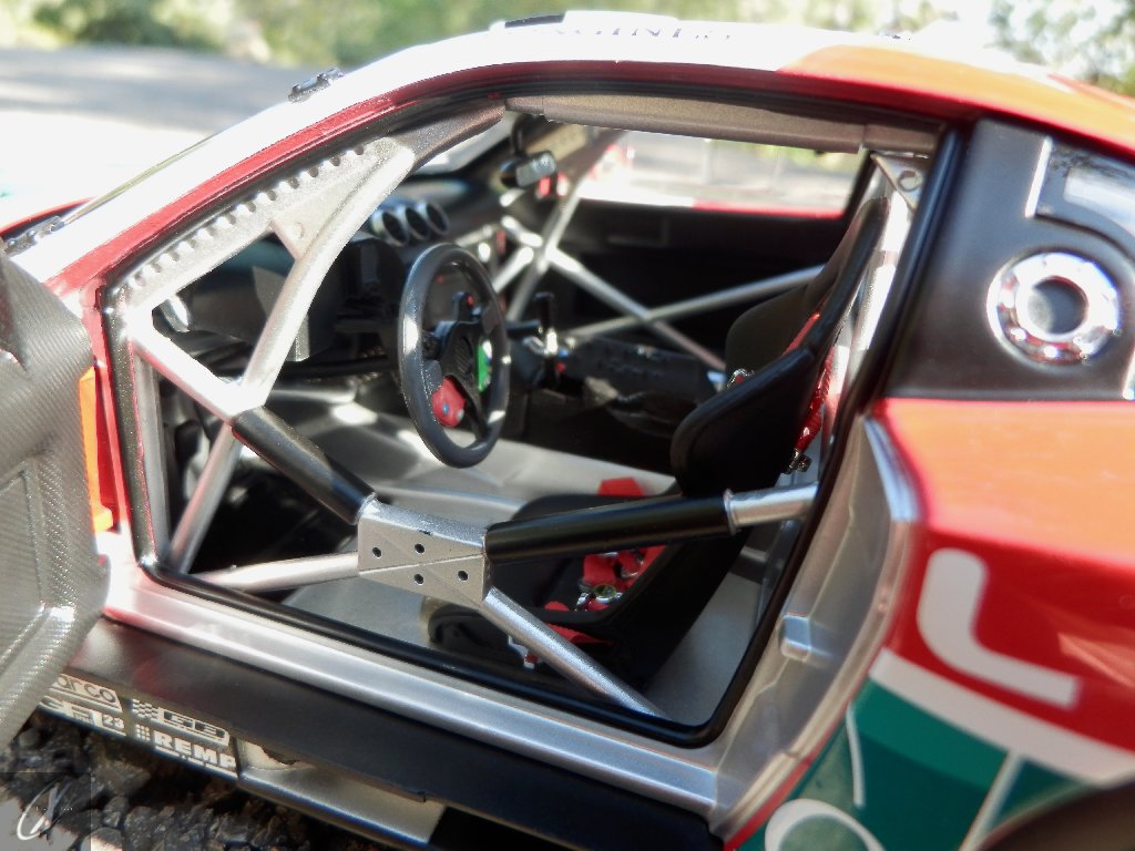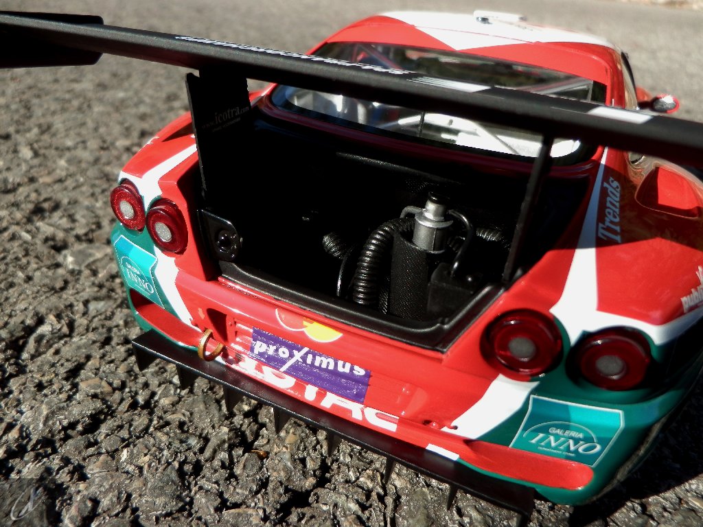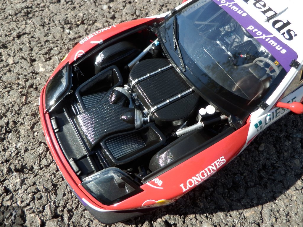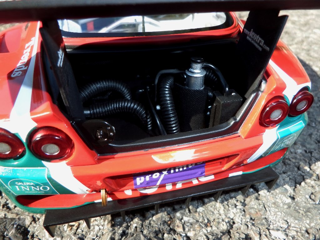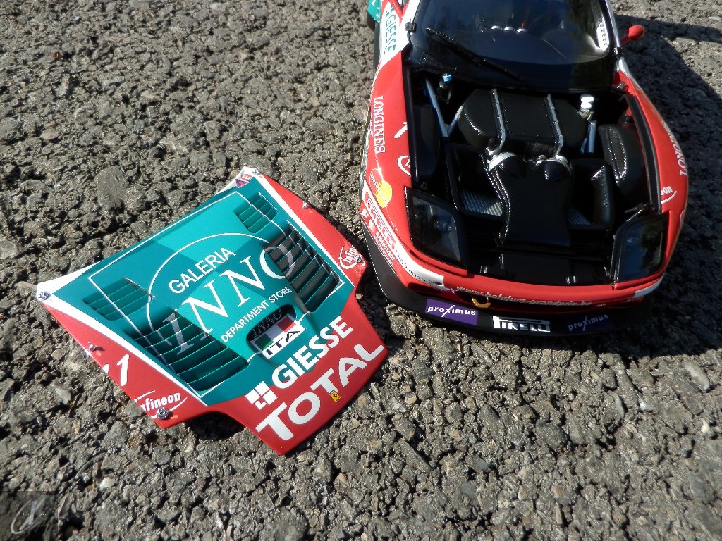 letterings respectivos e os discos, metálicos, rodam separados das pinças de travão (os originais são carbo-cerâmicos mas o aspecto visual não é muito diferente do que a Kyosho obteve). Como era apanágio nos "bons-velhos" Ferrari Kyosho, tudo abre: o capot e tampa da "bagageira" inclusive são totalmente removíveis como no modelo inicial e o primeiro tem inclusive os ganchos de fixação em metal; já na tampa da mala são feitos no molde da peça e pintados de alumínio. Só não percebo porque enquanto a entrada de ar para o radiador é aberta e tem efectivamente grelha em rede, as saídas de ar nos flancos são pedaços de plástico sólidos... Sob o capot, que tem todas as saídas de ar abertas, no meio de toda aquela fibra de carbono (replicada em relevo, um pouco como a Bburago e Welly fazem hoje em dia) mora um V12 bem reproduzido mas denota-se a falta de mais tubagens e, por exemplo, os tanques remotos dos amortecedores hidráulicos. O interior está bastante completo, com a roll-cage integral (embora as perfurações sejam apenas depressões no molde e não de lado a lado), cinto de segurança de 4 apoios em tecido com fivelas metálicas. A pega do volante é que é demasiado brilhante para ter aspecto convincente. No lado do "passageiro", toda a miríade de caixas de gestão electrónica, telemetria, rádio e extintor bem representados, com cablagem a ligar tudo em boa medida. Atrás, na "bagageira" mora o que creio ser o depósito do óleo e o radiador da caixa, assim como as tubagens de arrefecimento do dito radiador e travões traseiros, que são apenas plástico preto em vez de melhor replicarem as mangas flexíveis laranjas usadas no original. De qualquer das formas, independentemente das imperfeições que tanto este como qualquer outro modelo têm, esta é uma excelente representação de um belo automóvel de competição!