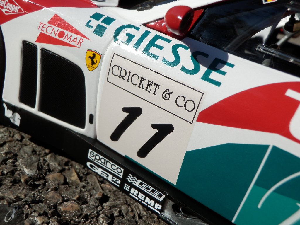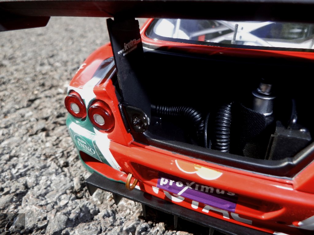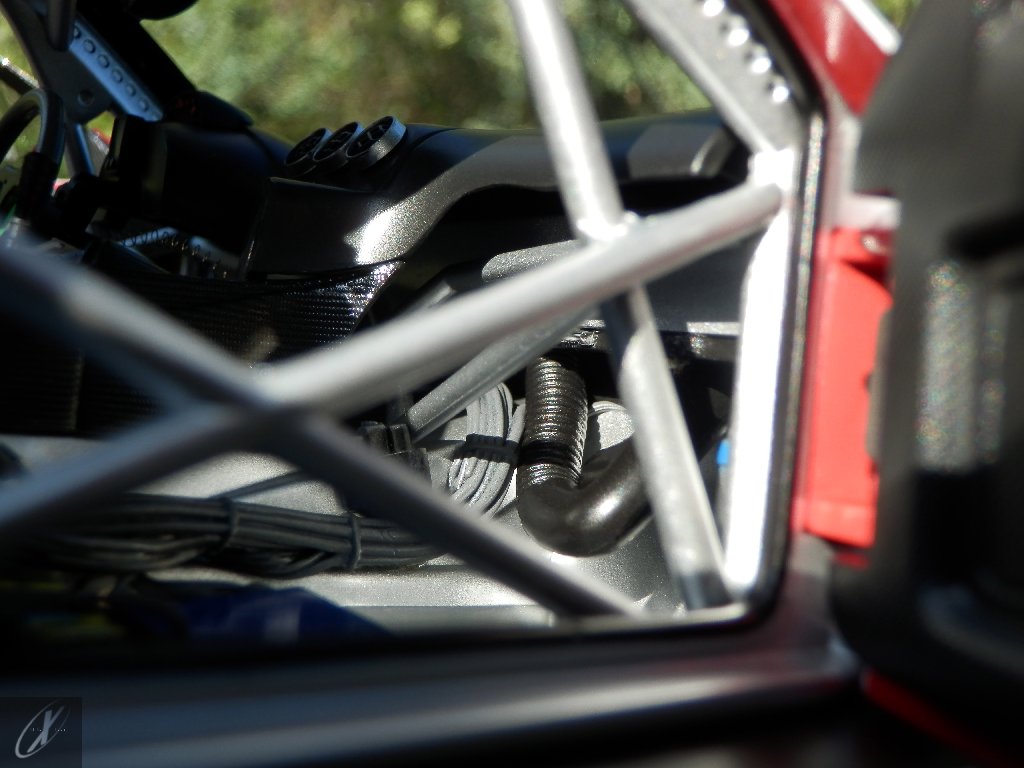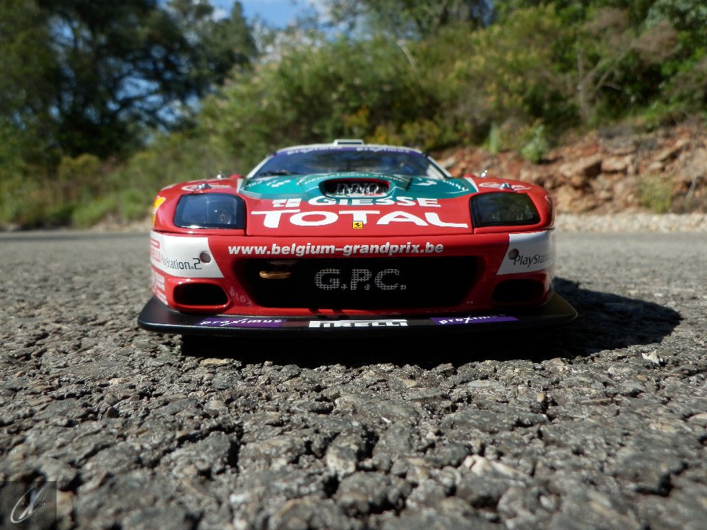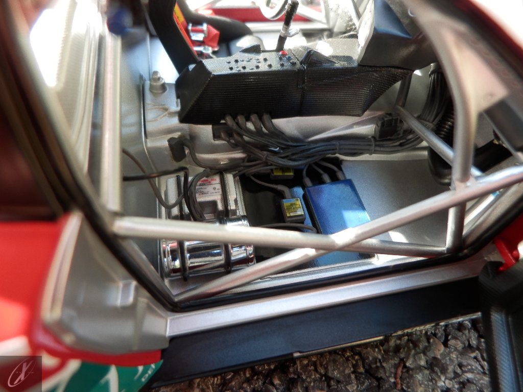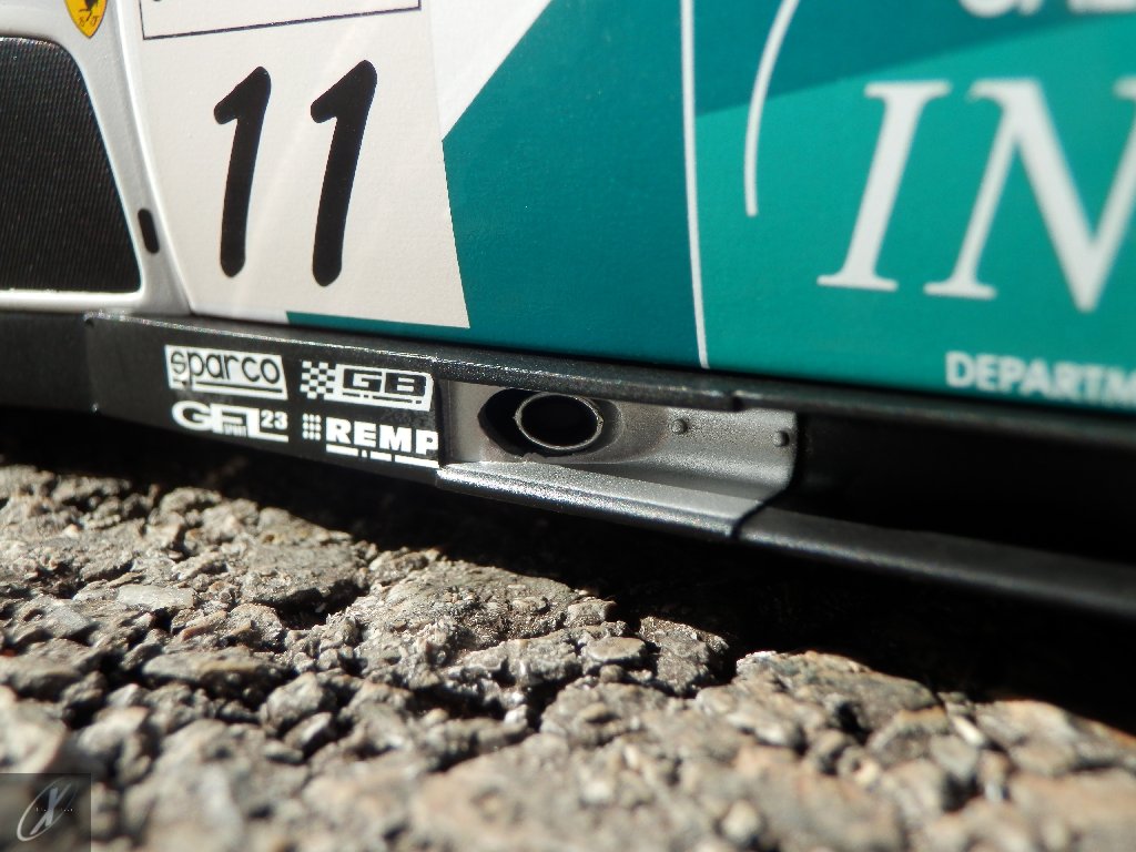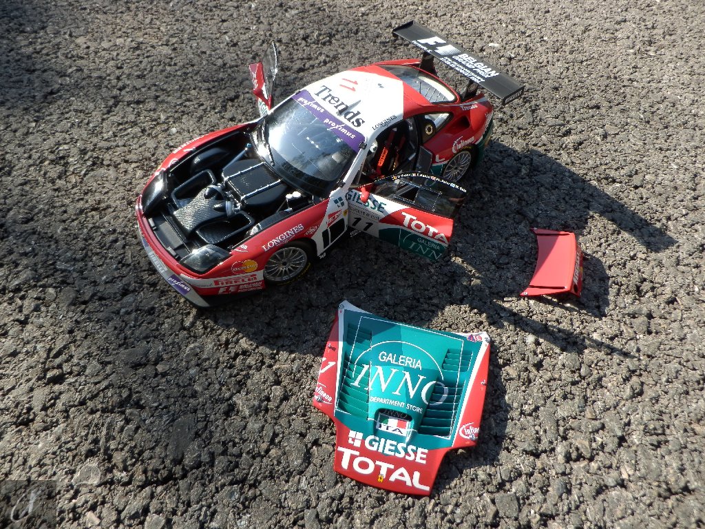 letterings respectivos e os discos, metálicos, rodam separados das pinças de travão (os originais são carbo-cerâmicos mas o aspecto visual não é muito diferente do que a Kyosho obteve). Como era apanágio nos "bons-velhos" Ferrari Kyosho, tudo abre: o capot e tampa da "bagageira" inclusive são totalmente removíveis como no modelo inicial e o primeiro tem inclusive os ganchos de fixação em metal; já na tampa da mala são feitos no molde da peça e pintados de alumínio. Só não percebo porque enquanto a entrada de ar para o radiador é aberta e tem efectivamente grelha em rede, as saídas de ar nos flancos são pedaços de plástico sólidos... Sob o capot, que tem todas as saídas de ar abertas, no meio de toda aquela fibra de carbono (replicada em relevo, um pouco como a Bburago e Welly fazem hoje em dia) mora um V12 bem reproduzido mas denota-se a falta de mais tubagens e, por exemplo, os tanques remotos dos amortecedores hidráulicos. O interior está bastante completo, com a roll-cage integral (embora as perfurações sejam apenas depressões no molde e não de lado a lado), cinto de segurança de 4 apoios em tecido com fivelas metálicas. A pega do volante é que é demasiado brilhante para ter aspecto convincente. No lado do "passageiro", toda a miríade de caixas de gestão electrónica, telemetria, rádio e extintor bem representados, com cablagem a ligar tudo em boa medida. Atrás, na "bagageira" mora o que creio ser o depósito do óleo e o radiador da caixa, assim como as tubagens de arrefecimento do dito radiador e travões traseiros, que são apenas plástico preto em vez de melhor replicarem as mangas flexíveis laranjas usadas no original. De qualquer das formas, independentemente das imperfeições que tanto este como qualquer outro modelo têm, esta é uma excelente representação de um belo automóvel de competição!