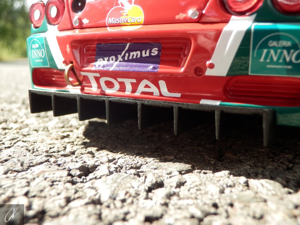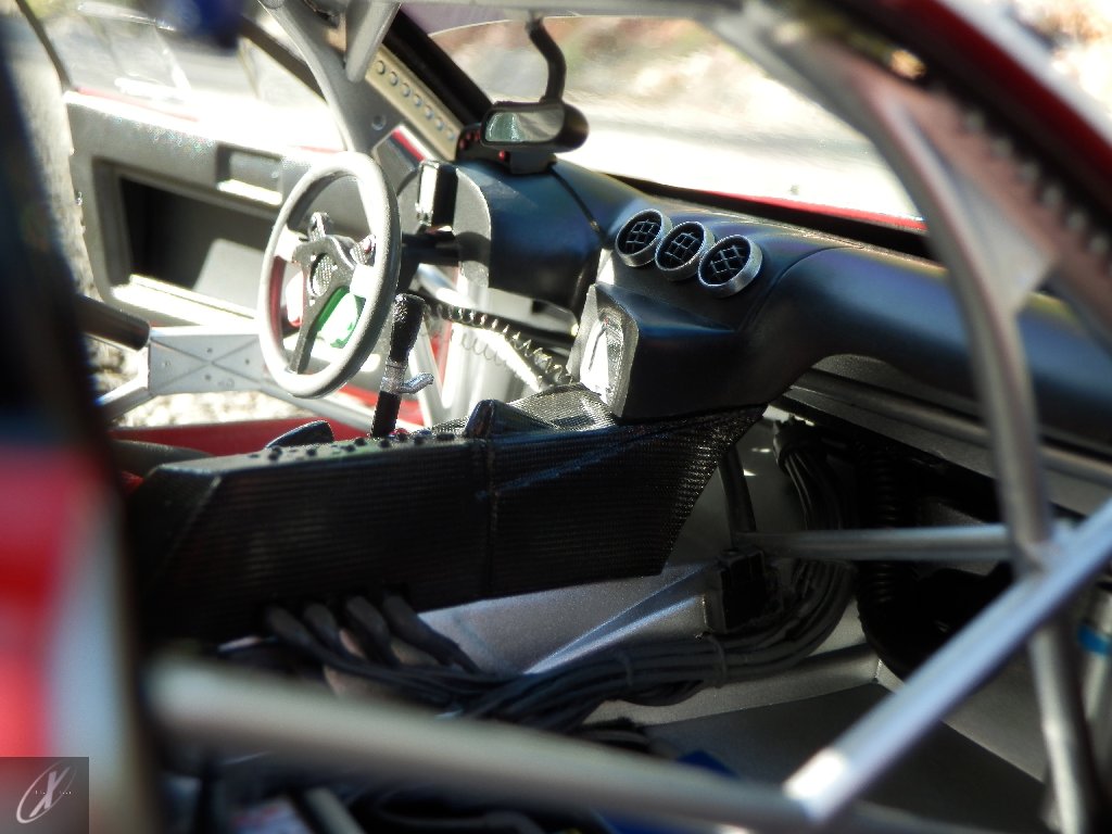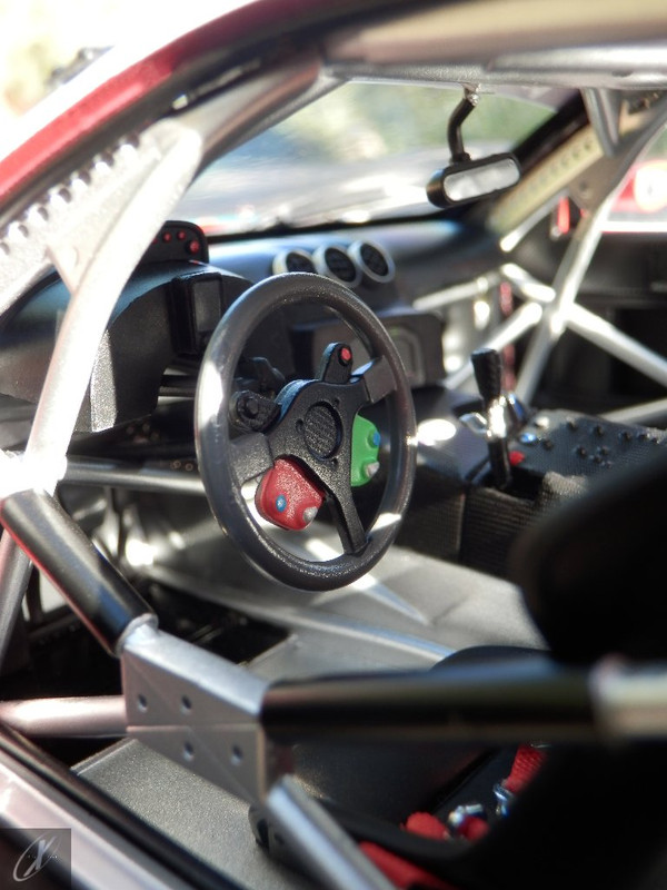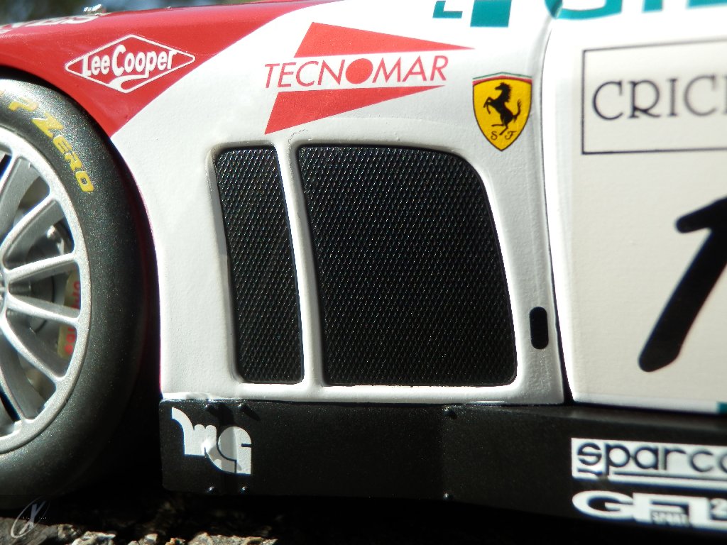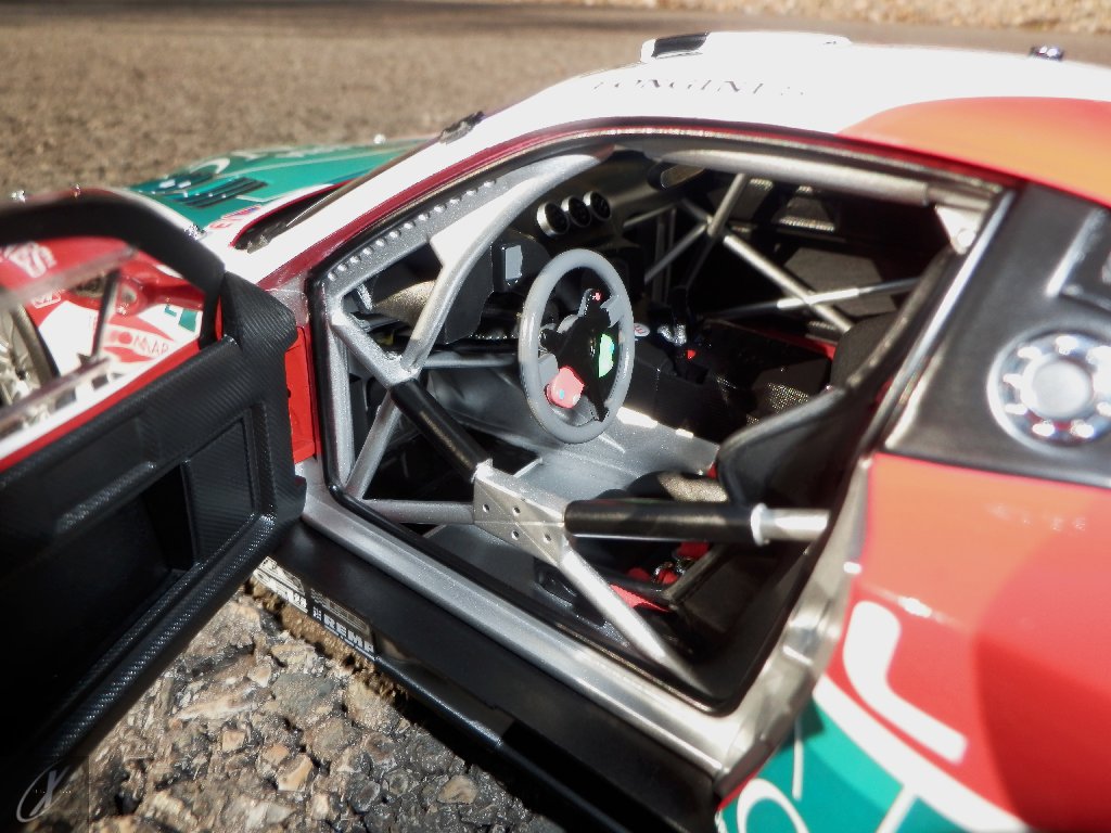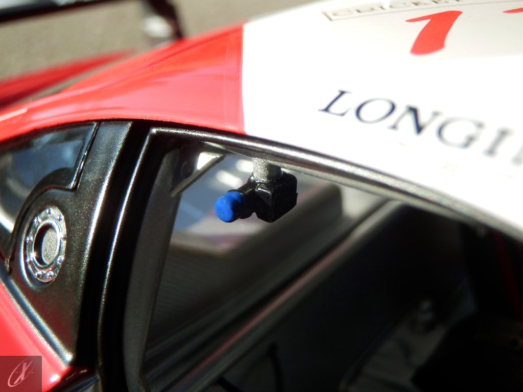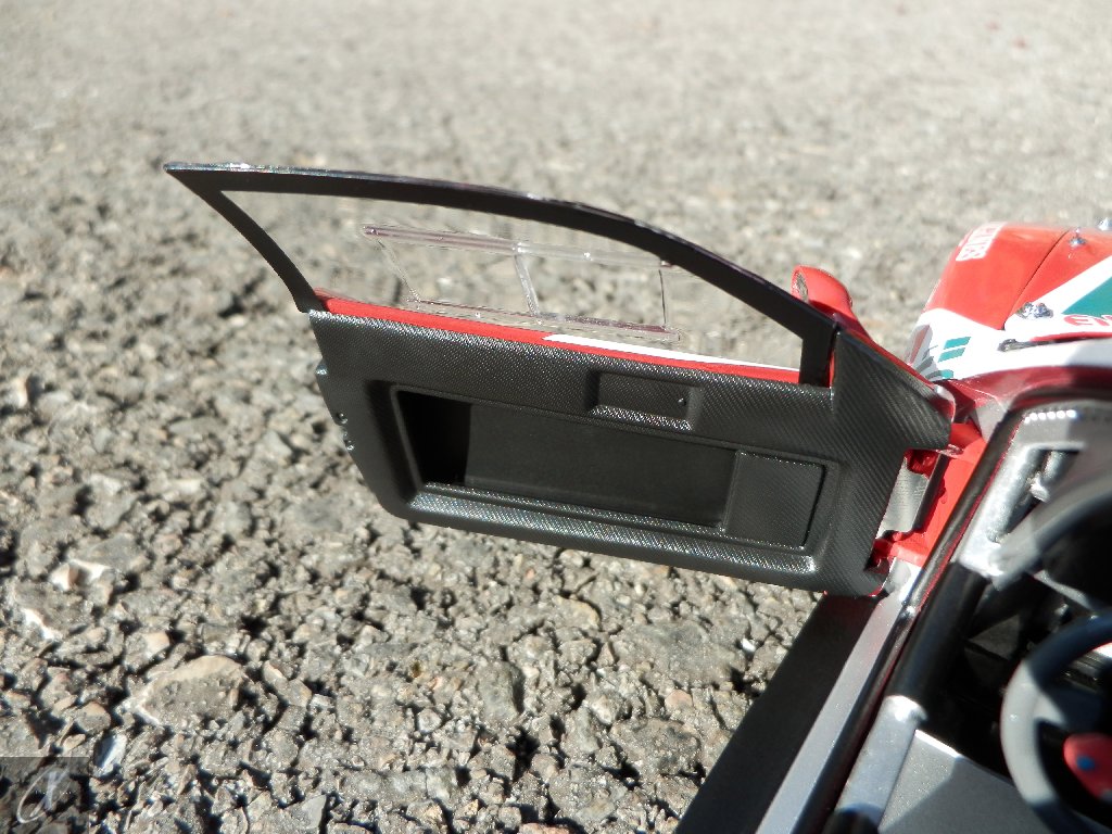 letterings respectivos e os discos, metálicos, rodam separados das pinças de travão (os originais são carbo-cerâmicos mas o aspecto visual não é muito diferente do que a Kyosho obteve). Como era apanágio nos "bons-velhos" Ferrari Kyosho, tudo abre: o capot e tampa da "bagageira" inclusive são totalmente removíveis como no modelo inicial e o primeiro tem inclusive os ganchos de fixação em metal; já na tampa da mala são feitos no molde da peça e pintados de alumínio. Só não percebo porque enquanto a entrada de ar para o radiador é aberta e tem efectivamente grelha em rede, as saídas de ar nos flancos são pedaços de plástico sólidos... Sob o capot, que tem todas as saídas de ar abertas, no meio de toda aquela fibra de carbono (replicada em relevo, um pouco como a Bburago e Welly fazem hoje em dia) mora um V12 bem reproduzido mas denota-se a falta de mais tubagens e, por exemplo, os tanques remotos dos amortecedores hidráulicos. O interior está bastante completo, com a roll-cage integral (embora as perfurações sejam apenas depressões no molde e não de lado a lado), cinto de segurança de 4 apoios em tecido com fivelas metálicas. A pega do volante é que é demasiado brilhante para ter aspecto convincente. No lado do "passageiro", toda a miríade de caixas de gestão electrónica, telemetria, rádio e extintor bem representados, com cablagem a ligar tudo em boa medida. Atrás, na "bagageira" mora o que creio ser o depósito do óleo e o radiador da caixa, assim como as tubagens de arrefecimento do dito radiador e travões traseiros, que são apenas plástico preto em vez de melhor replicarem as mangas flexíveis laranjas usadas no original. De qualquer das formas, independentemente das imperfeições que tanto este como qualquer outro modelo têm, esta é uma excelente representação de um belo automóvel de competição!