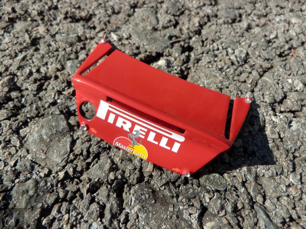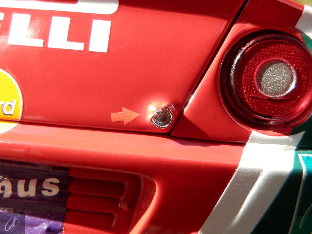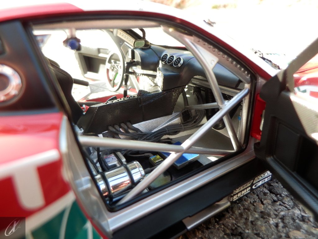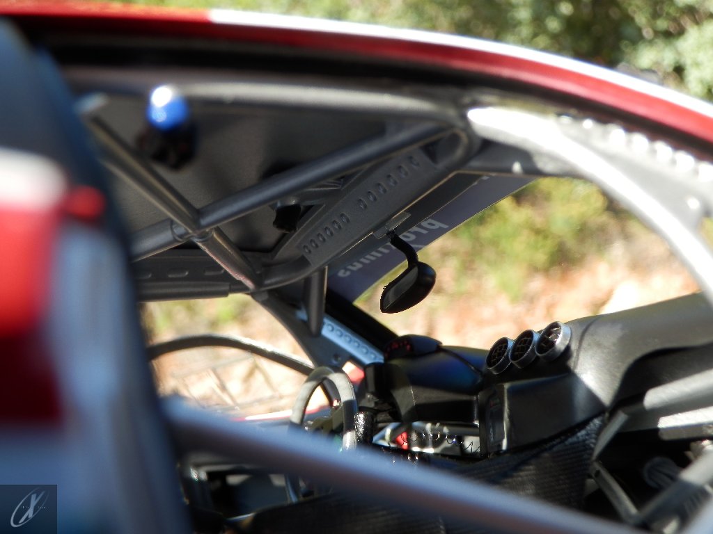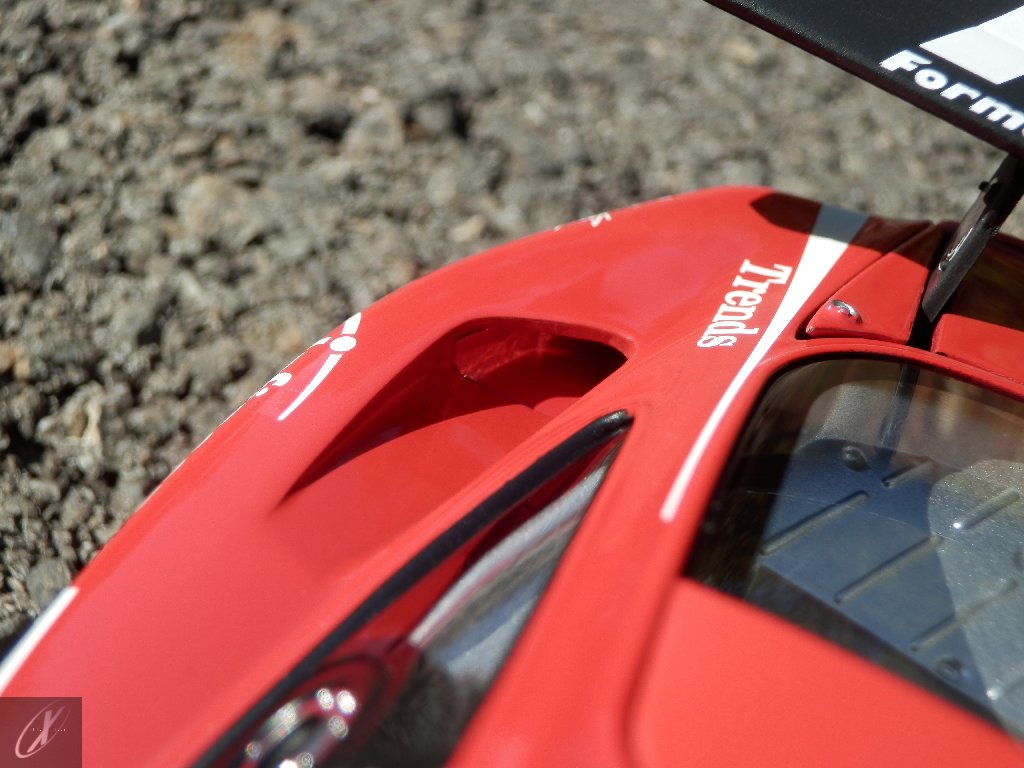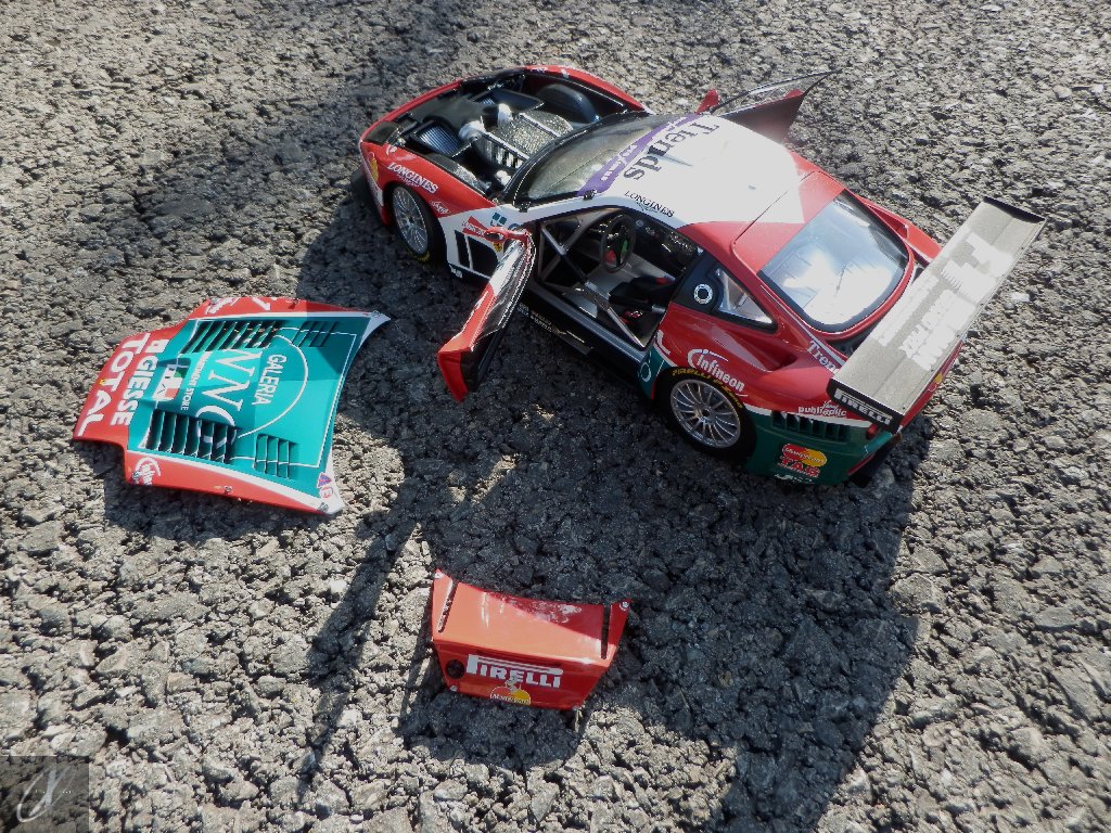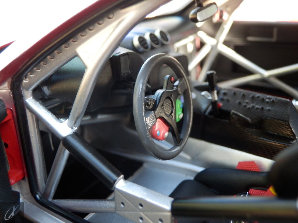 letterings respectivos e os discos, metálicos, rodam separados das pinças de travão (os originais são carbo-cerâmicos mas o aspecto visual não é muito diferente do que a Kyosho obteve). Como era apanágio nos "bons-velhos" Ferrari Kyosho, tudo abre: o capot e tampa da "bagageira" inclusive são totalmente removíveis como no modelo inicial e o primeiro tem inclusive os ganchos de fixação em metal; já na tampa da mala são feitos no molde da peça e pintados de alumínio. Só não percebo porque enquanto a entrada de ar para o radiador é aberta e tem efectivamente grelha em rede, as saídas de ar nos flancos são pedaços de plástico sólidos... Sob o capot, que tem todas as saídas de ar abertas, no meio de toda aquela fibra de carbono (replicada em relevo, um pouco como a Bburago e Welly fazem hoje em dia) mora um V12 bem reproduzido mas denota-se a falta de mais tubagens e, por exemplo, os tanques remotos dos amortecedores hidráulicos. O interior está bastante completo, com a roll-cage integral (embora as perfurações sejam apenas depressões no molde e não de lado a lado), cinto de segurança de 4 apoios em tecido com fivelas metálicas. A pega do volante é que é demasiado brilhante para ter aspecto convincente. No lado do "passageiro", toda a miríade de caixas de gestão electrónica, telemetria, rádio e extintor bem representados, com cablagem a ligar tudo em boa medida. Atrás, na "bagageira" mora o que creio ser o depósito do óleo e o radiador da caixa, assim como as tubagens de arrefecimento do dito radiador e travões traseiros, que são apenas plástico preto em vez de melhor replicarem as mangas flexíveis laranjas usadas no original. De qualquer das formas, independentemente das imperfeições que tanto este como qualquer outro modelo têm, esta é uma excelente representação de um belo automóvel de competição!