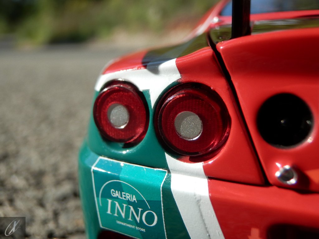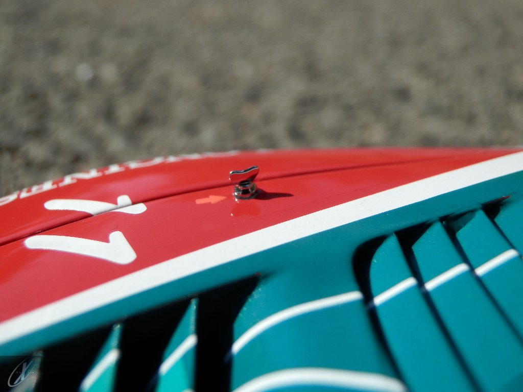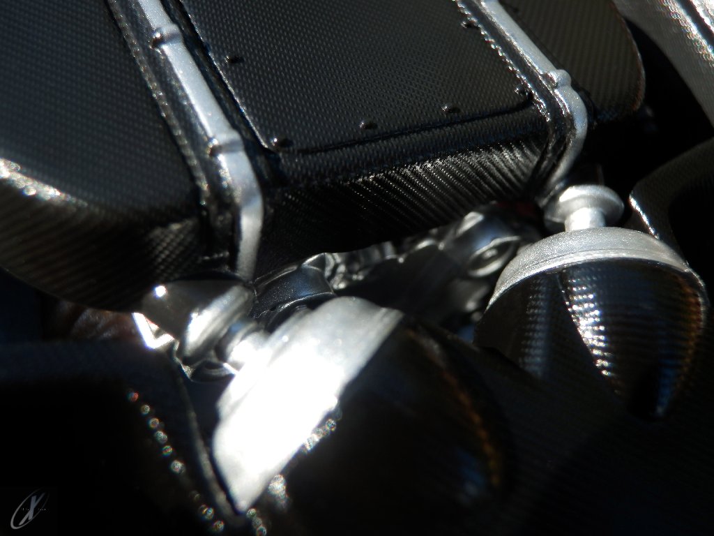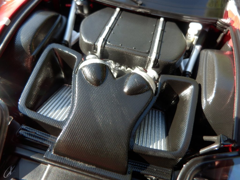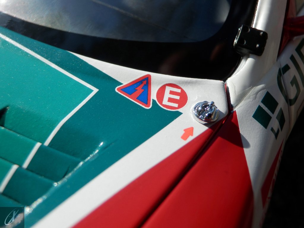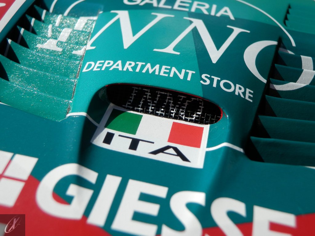 letterings respectivos e os discos, metálicos, rodam separados das pinças de travão (os originais são carbo-cerâmicos mas o aspecto visual não é muito diferente do que a Kyosho obteve). Como era apanágio nos "bons-velhos" Ferrari Kyosho, tudo abre: o capot e tampa da "bagageira" inclusive são totalmente removíveis como no modelo inicial e o primeiro tem inclusive os ganchos de fixação em metal; já na tampa da mala são feitos no molde da peça e pintados de alumínio. Só não percebo porque enquanto a entrada de ar para o radiador é aberta e tem efectivamente grelha em rede, as saídas de ar nos flancos são pedaços de plástico sólidos... Sob o capot, que tem todas as saídas de ar abertas, no meio de toda aquela fibra de carbono (replicada em relevo, um pouco como a Bburago e Welly fazem hoje em dia) mora um V12 bem reproduzido mas denota-se a falta de mais tubagens e, por exemplo, os tanques remotos dos amortecedores hidráulicos. O interior está bastante completo, com a roll-cage integral (embora as perfurações sejam apenas depressões no molde e não de lado a lado), cinto de segurança de 4 apoios em tecido com fivelas metálicas. A pega do volante é que é demasiado brilhante para ter aspecto convincente. No lado do "passageiro", toda a miríade de caixas de gestão electrónica, telemetria, rádio e extintor bem representados, com cablagem a ligar tudo em boa medida. Atrás, na "bagageira" mora o que creio ser o depósito do óleo e o radiador da caixa, assim como as tubagens de arrefecimento do dito radiador e travões traseiros, que são apenas plástico preto em vez de melhor replicarem as mangas flexíveis laranjas usadas no original. De qualquer das formas, independentemente das imperfeições que tanto este como qualquer outro modelo têm, esta é uma excelente representação de um belo automóvel de competição!