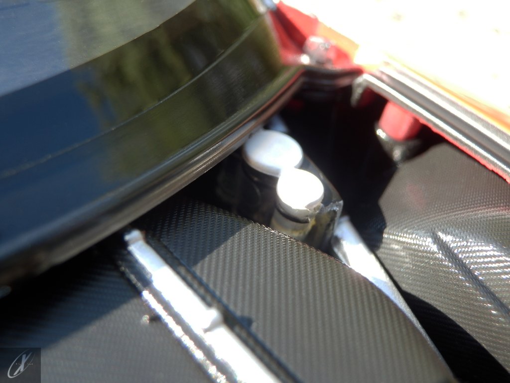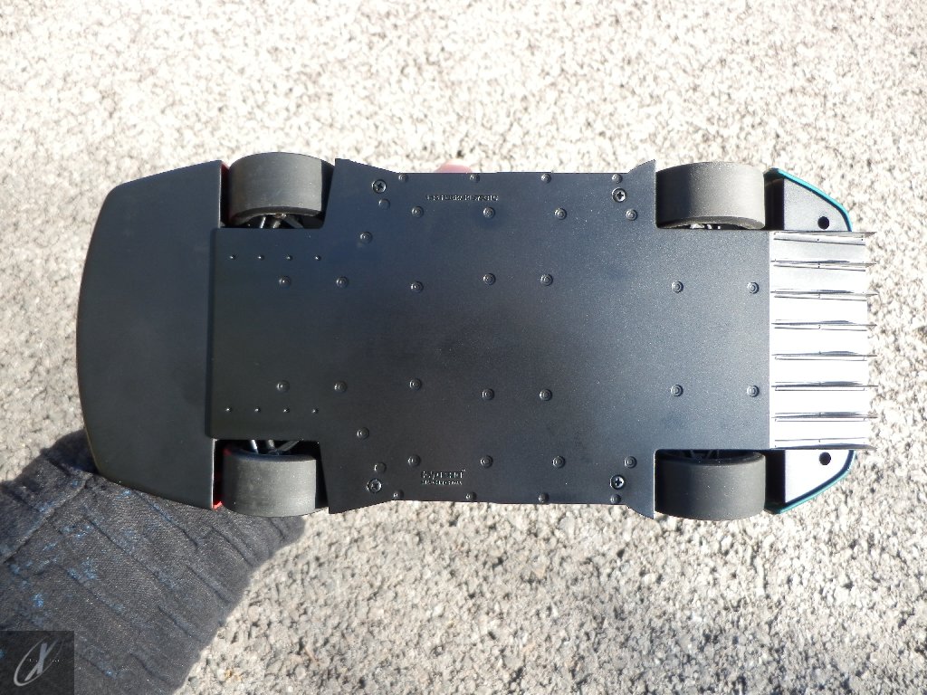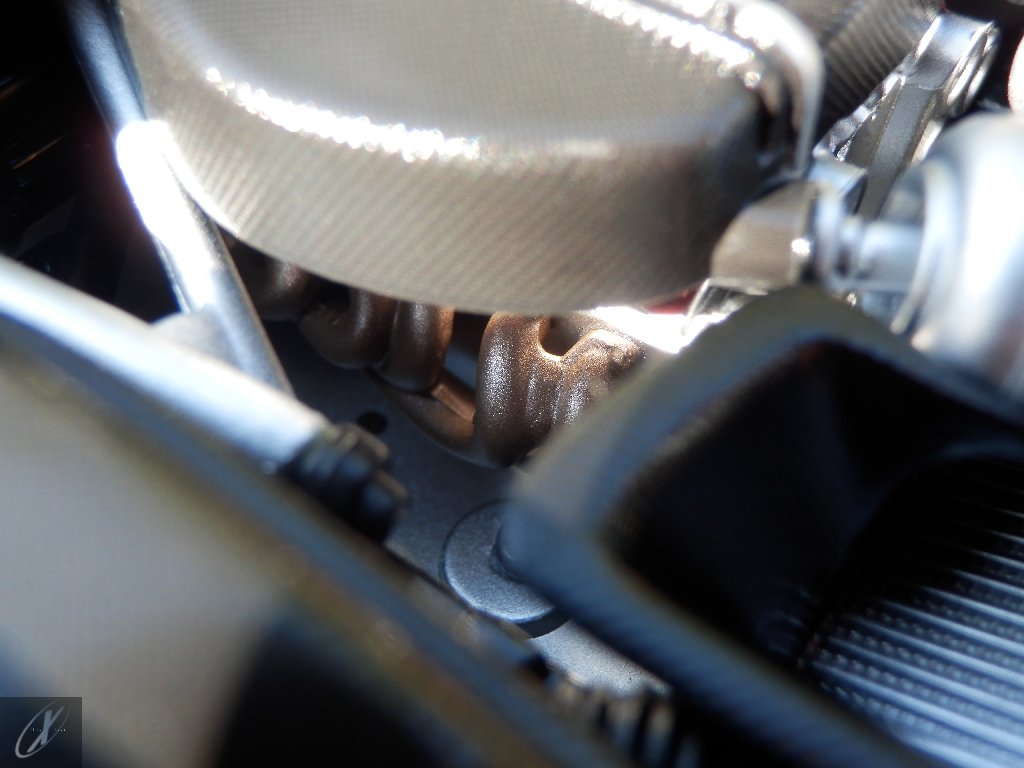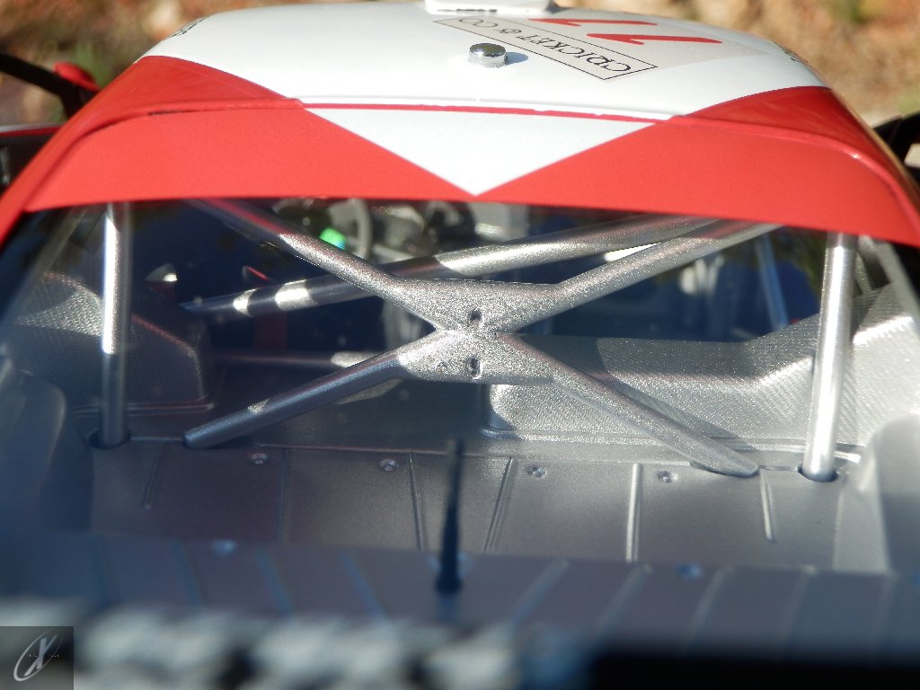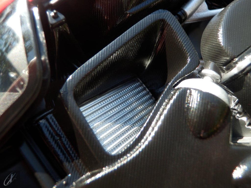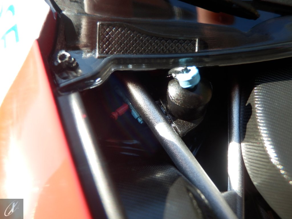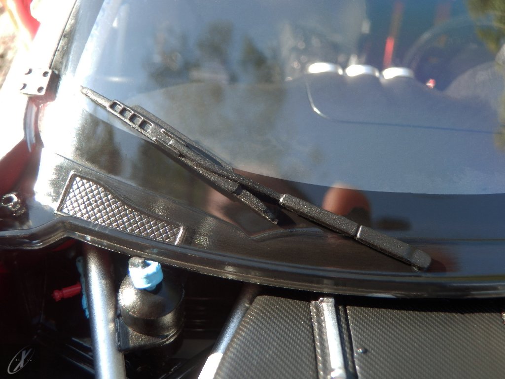 letterings respectivos e os discos, metálicos, rodam separados das pinças de travão (os originais são carbo-cerâmicos mas o aspecto visual não é muito diferente do que a Kyosho obteve). Como era apanágio nos "bons-velhos" Ferrari Kyosho, tudo abre: o capot e tampa da "bagageira" inclusive são totalmente removíveis como no modelo inicial e o primeiro tem inclusive os ganchos de fixação em metal; já na tampa da mala são feitos no molde da peça e pintados de alumínio. Só não percebo porque enquanto a entrada de ar para o radiador é aberta e tem efectivamente grelha em rede, as saídas de ar nos flancos são pedaços de plástico sólidos... Sob o capot, que tem todas as saídas de ar abertas, no meio de toda aquela fibra de carbono (replicada em relevo, um pouco como a Bburago e Welly fazem hoje em dia) mora um V12 bem reproduzido mas denota-se a falta de mais tubagens e, por exemplo, os tanques remotos dos amortecedores hidráulicos. O interior está bastante completo, com a roll-cage integral (embora as perfurações sejam apenas depressões no molde e não de lado a lado), cinto de segurança de 4 apoios em tecido com fivelas metálicas. A pega do volante é que é demasiado brilhante para ter aspecto convincente. No lado do "passageiro", toda a miríade de caixas de gestão electrónica, telemetria, rádio e extintor bem representados, com cablagem a ligar tudo em boa medida. Atrás, na "bagageira" mora o que creio ser o depósito do óleo e o radiador da caixa, assim como as tubagens de arrefecimento do dito radiador e travões traseiros, que são apenas plástico preto em vez de melhor replicarem as mangas flexíveis laranjas usadas no original. De qualquer das formas, independentemente das imperfeições que tanto este como qualquer outro modelo têm, esta é uma excelente representação de um belo automóvel de competição!