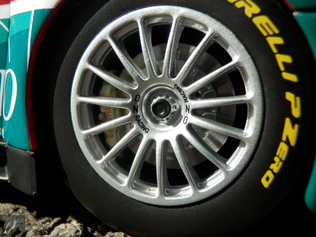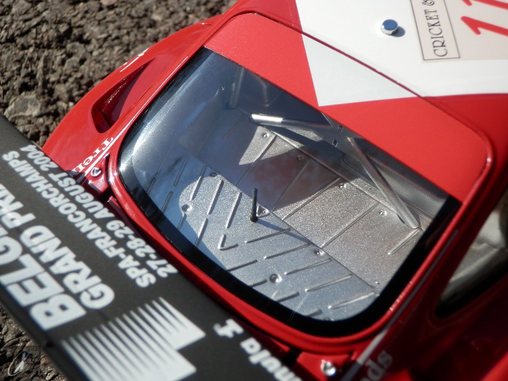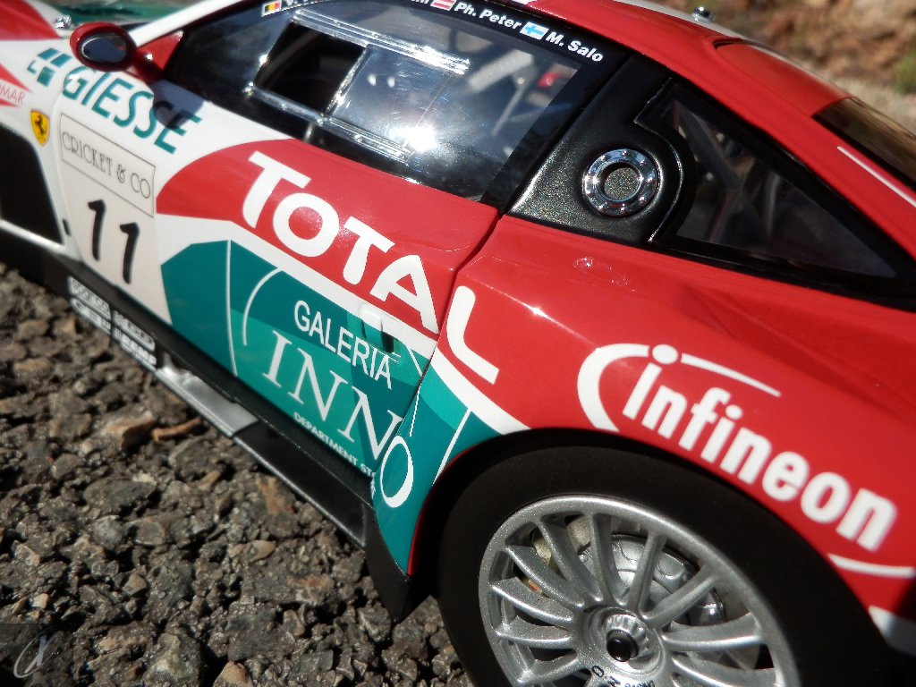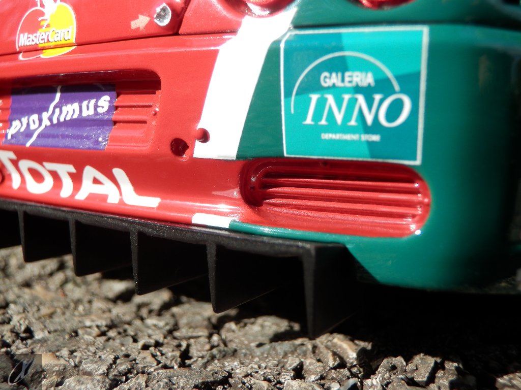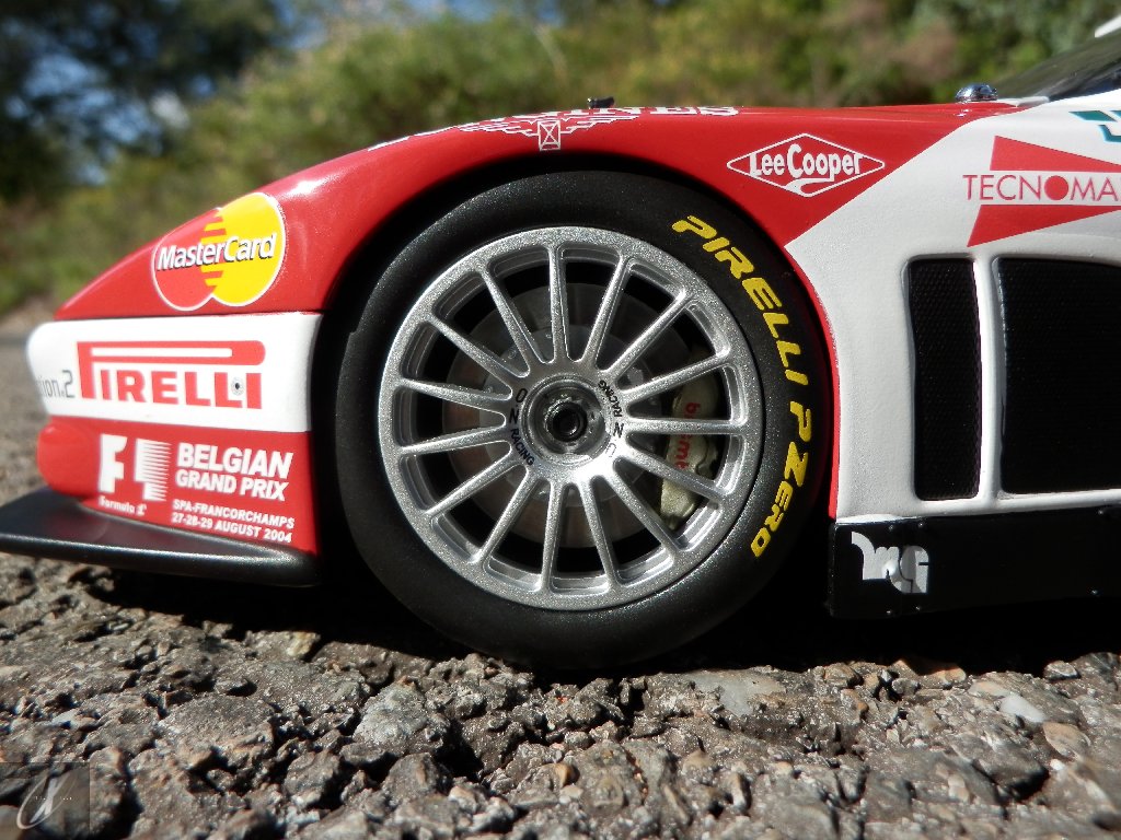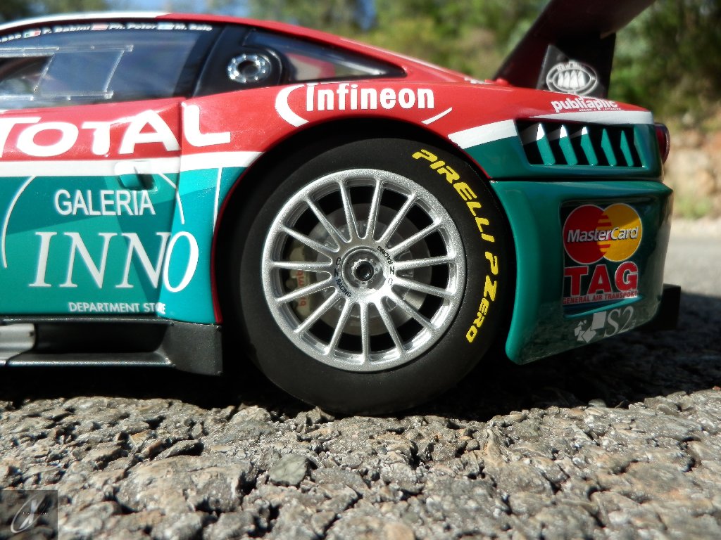 O modelo que vos trago, representado à escala 1:18 pela Kyosho representa precisamente o chassis #2216 que ficou em 2º lugar nas 24 h de Spa em 2003. O molde é excelente e está muito bem proporcionado e no geral os decalques parecem muito bem aplicados (excepto o que passa sobre a entrada de ar no tejadilho, que ficou "no ar" do lado esquerdo), só na união onde se sobrepõem diferentes folhas se nota um rebordo mais alto. Ainda assim, todos "batem certo" entre os diferentes painéis e tanto quanto consegui apurar estão completos e correctos para a corrida em questão. Os pneus e jantes também estão em excelente plano, com os