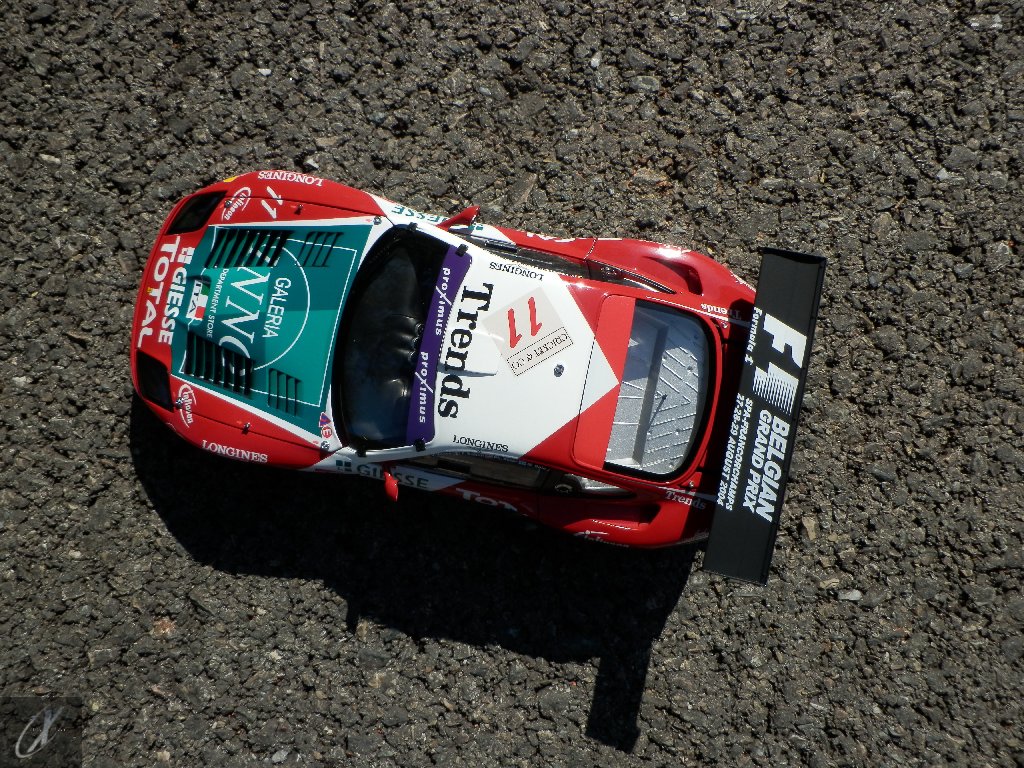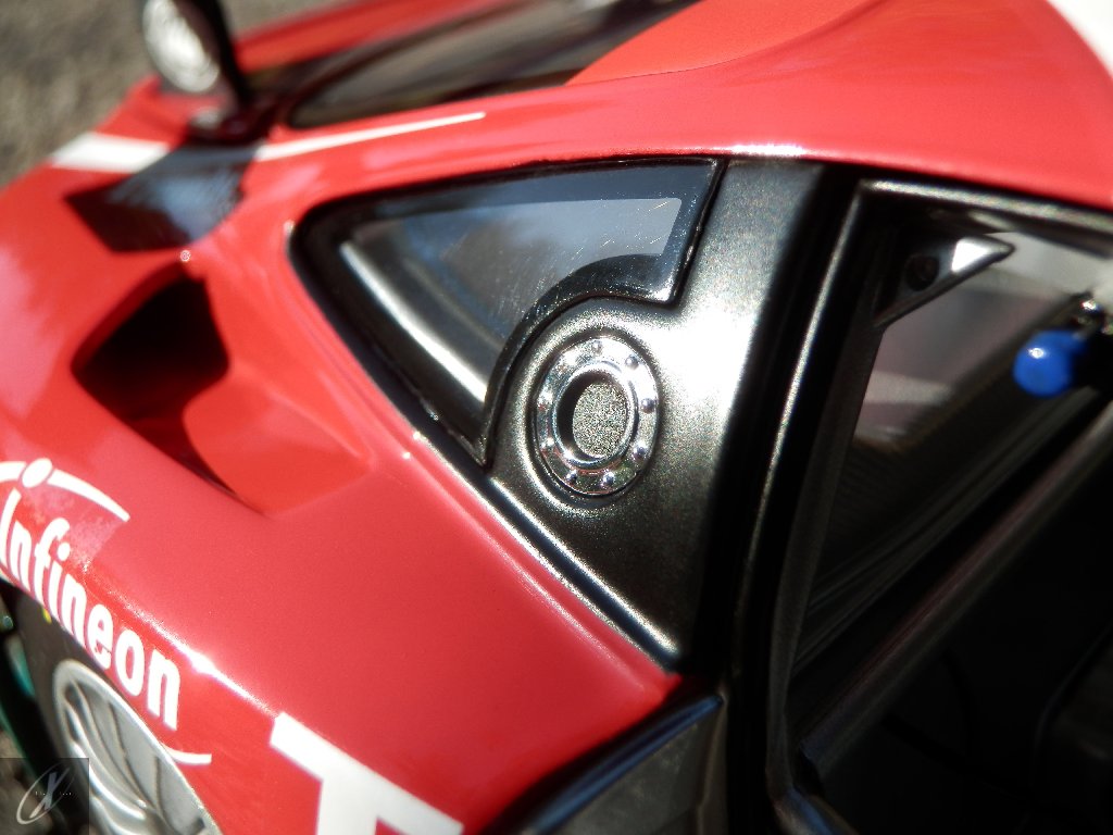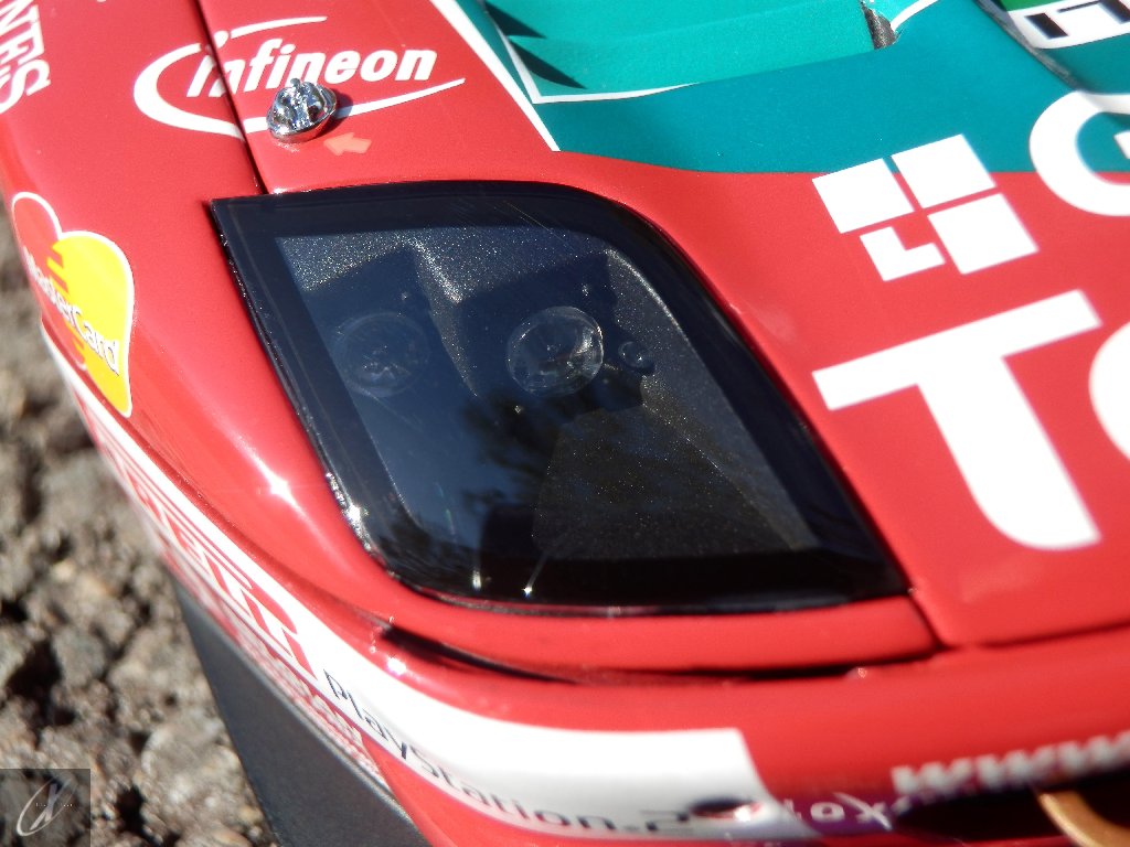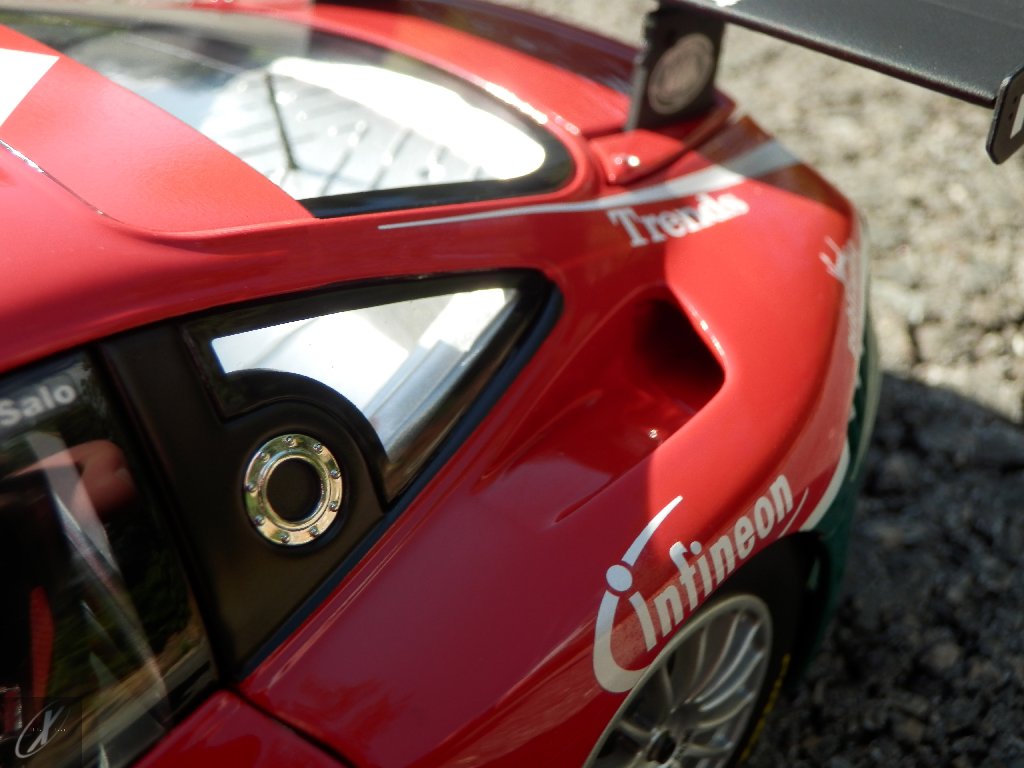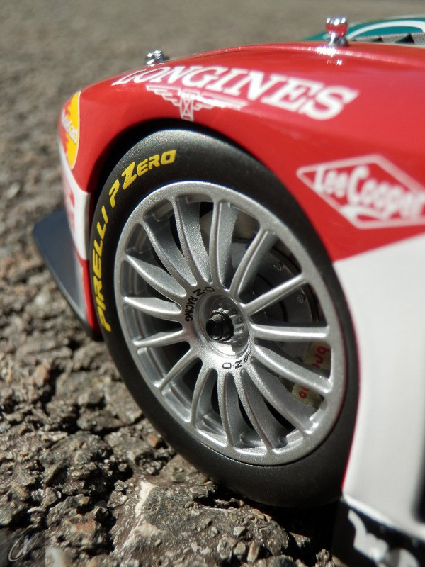 O modelo que vos trago, representado à escala 1:18 pela Kyosho representa precisamente o chassis #2216 que ficou em 2º lugar nas 24 h de Spa em 2003. O molde é excelente e está muito bem proporcionado e no geral os decalques parecem muito bem aplicados (excepto o que passa sobre a entrada de ar no tejadilho, que ficou "no ar" do lado esquerdo), só na união onde se sobrepõem diferentes folhas se nota um rebordo mais alto. Ainda assim, todos "batem certo" entre os diferentes painéis e tanto quanto consegui apurar estão completos e correctos para a corrida em questão. Os pneus e jantes também estão em excelente plano, com os