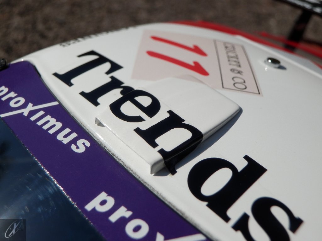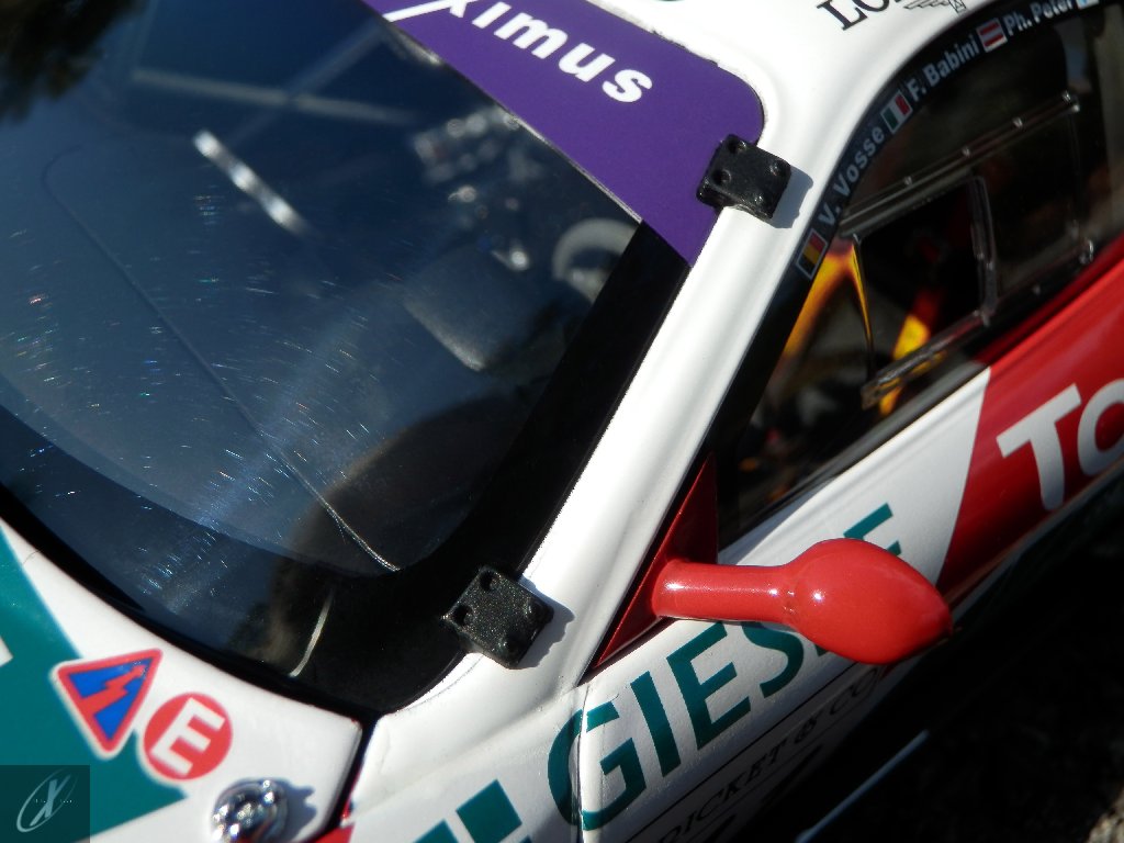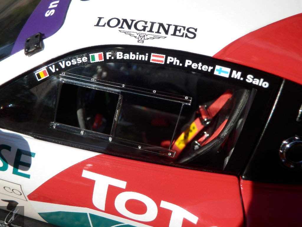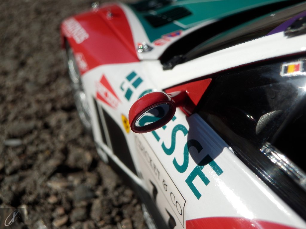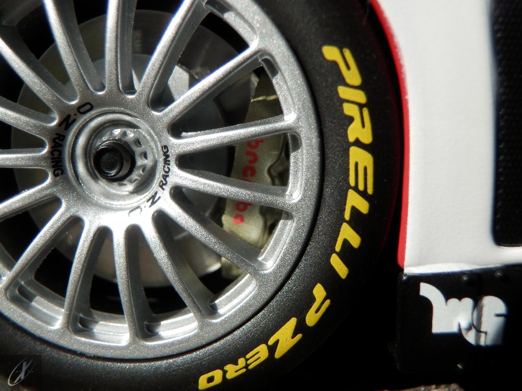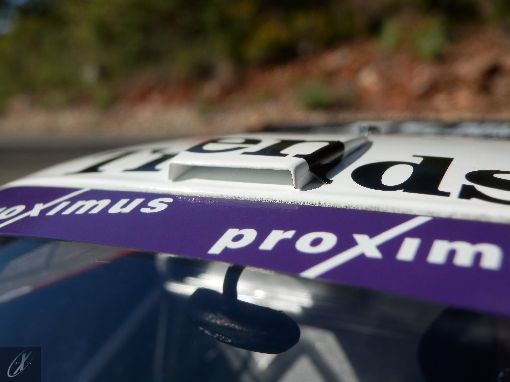 O modelo que vos trago, representado à escala 1:18 pela Kyosho representa precisamente o chassis #2216 que ficou em 2º lugar nas 24 h de Spa em 2003. O molde é excelente e está muito bem proporcionado e no geral os decalques parecem muito bem aplicados (excepto o que passa sobre a entrada de ar no tejadilho, que ficou "no ar" do lado esquerdo), só na união onde se sobrepõem diferentes folhas se nota um rebordo mais alto. Ainda assim, todos "batem certo" entre os diferentes painéis e tanto quanto consegui apurar estão completos e correctos para a corrida em questão. Os pneus e jantes também estão em excelente plano, com os