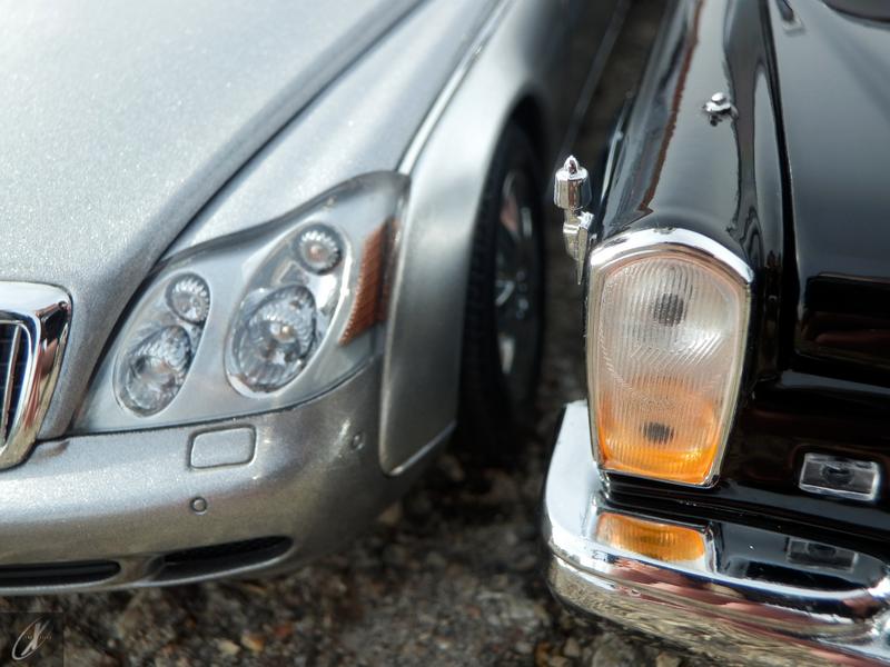 dog’s legs), encontra-se um interior sóbrio de execução aceitável, com cor e textura a imitar cabedal até com bom aspecto (excepto a inestética marca de molde no rebordo do tablier) mas a imitação de madeira no tablier e adornos das portas por tampogravura, analisadas mais de perto, denotam demasiado grão para serem realistas; já o volante tem muito bom aspecto e impõe-se no habitáculo com o aro cromado para a buzina. O piso não é alcatifado e os pedais fazem parte do molde do mesmo, apenas estão pintados de preto, algo que não era difícil fazer melhor. As portas de trás já apresentam um sistema de dobradiças esteticamente mais agradável (não percebo porque não fizeram o mesmo nas portas da frente…) mas os vidros das portas, muito grossos, estão só encostados à moldura em vez de dentro desta, o que estraga o ar de qualidade visto por fora. No habitáculo traseiro, a separação está bem realizada e o lugar do meio da 2ª fila de bancos até inclui um intercomunicador e um frigorífico (que não abre) com o mesmo acabamento de madeira de qualidade duvidosa. Também aqui, nada de alcatifa. E não aconselho a olharem para o interior do tejadilho pois só mostra que os vidros são uma peça que vai de lado a lado, algo recorrente em miniaturas bem mais baratas… Debaixo do capot está um motor bastante detalhado e que, salvo alguns detalhes que foram claramente atalhados (como as caixas de fusíveis ou as abraçadeiras das condutas de admissão e afins), está verdadeiramente bom! É pena que depois, na parte de baixo do modelo, esse cuidado não tenha sido mantido pois não tem essencialmente qualquer detalhe e a suspensão traseira foi quase totalmente suprimida. Mas pronto, a alternativa custa quase 5x isto e, ainda assim, é uma miniatura competente para quem gosta deste tipo de “barcaças” mas não quer gastar uma fortuna nelas.