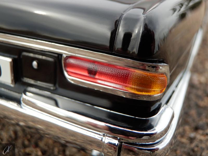letterings são apenas pintados, a grelha não é perfurada (apenas pintada de preto) e tanto nos faróis como nos farolins os pontos de fixação das ópticas são evidentes e inestéticas. E podiam também ter tido um pouco mais de cuidado com as ponteiras de escape, são sólidas e apenas pintadas a preto nas extremidades… Tenho no entanto que salientar o emblema no capot, realizado em fotoincisão e que confere logo um ar mais “sério” à miniatura e ao conjunto jante-pneu de perfil branco, que confere um ar extra de classe. Um pormenor que tenho que chamar à atenção diz respeito à tampa da mala: na caixa menciona “bagageira com abertura” mas quando se chega lá… nada! Publicidade enganadora…